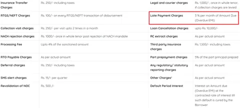 उदाहरण के तौर पर समझें, यदि आप कार लोन की ईएमआई भरने से चूक जाते हैं तो हमारे लोन के चार्ज शेड्यूल के अनुसार आपको कुल भुगतान की जाने वाली राशि का 3% प्रति माह भुगतान करना होगा।